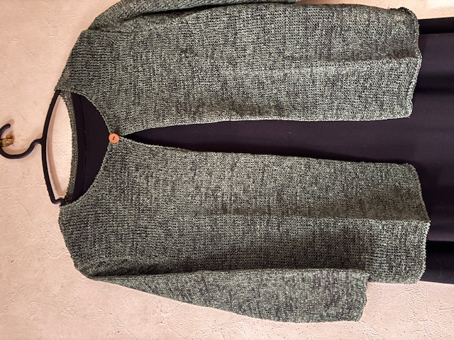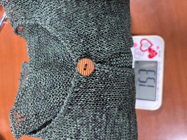 シルク100%擬麻加工糸の濃いめの緑系の1ボタンカーディガン